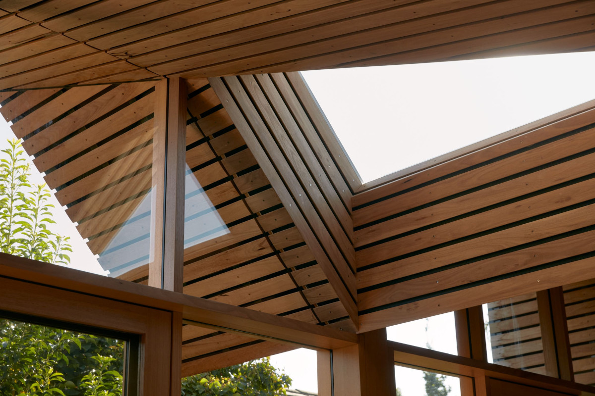 Inspired by the client's love for honest architecture and mid-century modern style, the extension features a blend of natural materials like concrete, masonry, and spotted gum timber defining key areas such as the living room, kitchen, and multipurpose room.